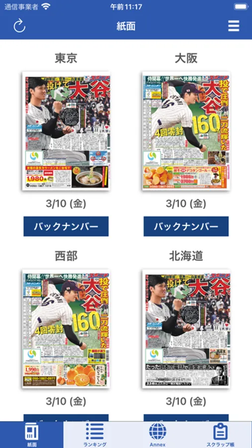 スポーツニッポン新聞社の購読者は東京本社、大阪本社、西部総局、北海道支局の発行紙面に加え、広島、福島、新潟、長野、静岡の各地方面のほか、少年向けに刊行されるスポニチジュニアなどをご覧いただけます。過去7日分のバックナンバーもございます(スポニチジュニアは90日分)。スクラップ機能が使えるほか、データをあらかじめダウンロードすることで、通信がつながらない場所でもお読みいただけます。
