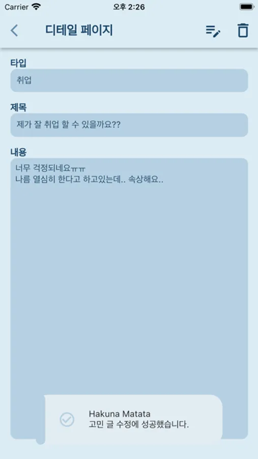 이제는 hakunamtata 에서 익명의 “고민 님” 이 되어 편하게 이야기 해보세요!