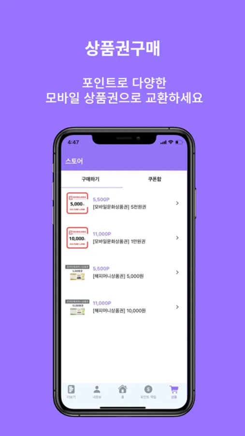 송포유에서 쌓은 포인트는 스토어에서 다양한 모바일 상품권으로 교환할 수 있습니다.
