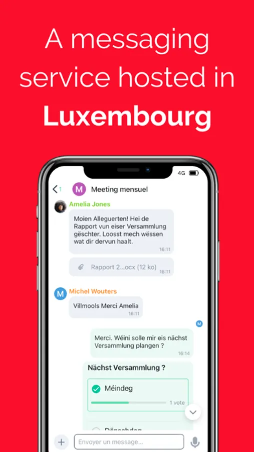 Luxchat4Gov is operated in Luxembourg, and, for maximum security, communications are end-to-end encrypted. Employees from the public sector can share text messages, documents, pictures, and videos bilateral or in group, public or private "chat rooms". They can also call another user, with or without video, share their location and much more.
