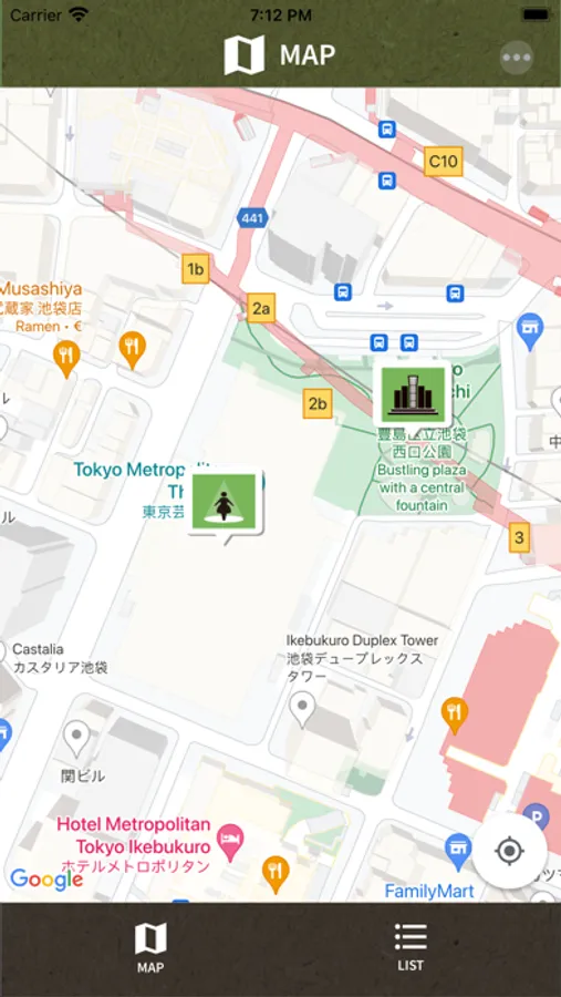 When you launch the app, a map of "Tokyo Heterotopia" will be displayed. Selecting an icon of a place to visit will reveal its name and category. Tap the ">" mark on the right to go to the page of individual places to visit. In the list of places to visit, you can check the name and the title of the story in a list view.