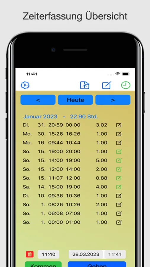 Erst mit dem klicken auf "Gehen" wird die Buchung gespeichert und erscheint in der Monatsübersicht.