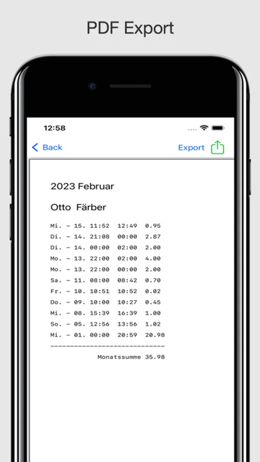 Kommen → Gehen → und am Ende des Monats einen Bericht als PDF zum ausdrucken oder weiterleiten erstellen.