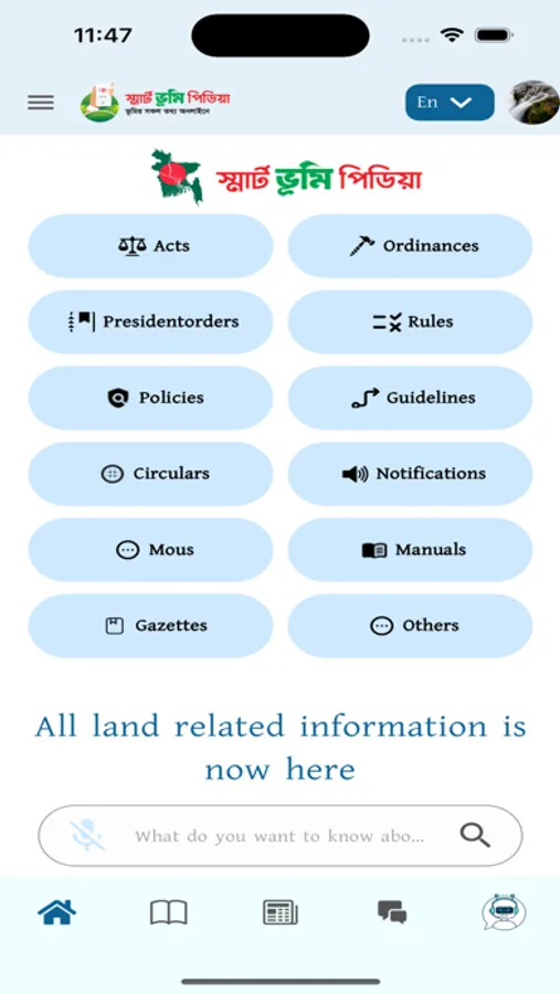 Smart Bhumipedia is a legal document app that offers easy access to a wide range of legal information related to land affairs in Bangladesh, including various laws, acts, ordinances, rules, regulations, policies, guidelines, MoUs, and manuals found in Bangladesh Gazettes. These resources are publicly available and serve as a valuable reference for understanding land-related matters in the country. All type of Land related information can be found with details.