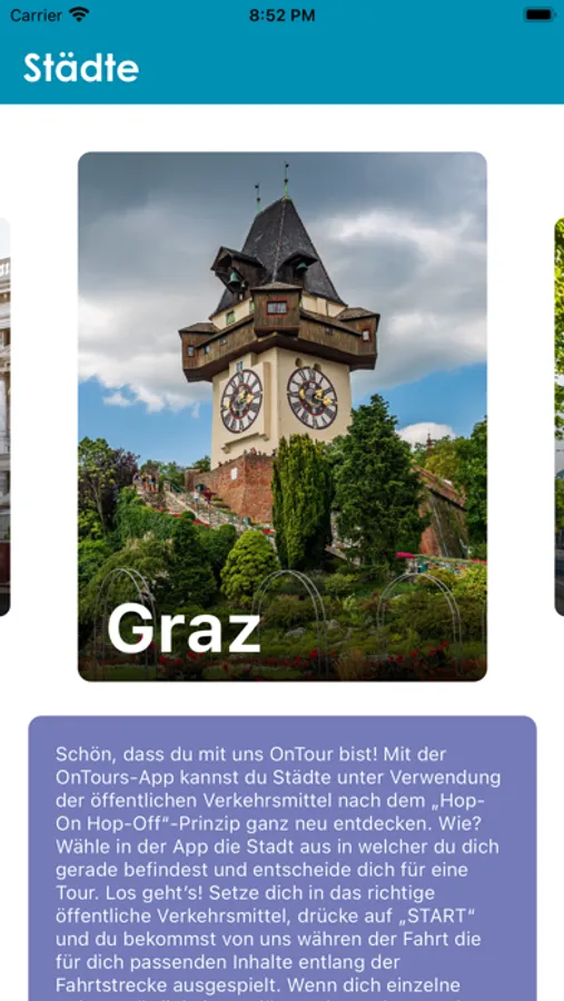 Die OnTours-App verwandelt öffentliche Verkehrsmittel in ausgewählten Partnerstädten zu individuellen "Hop-On Hop-Off"-Erlebnisfahrten. Setze dich in einer der OnTours-Städte einfach in die Straßenbahn oder den Bus, starte die App und erlebe eine Tour, die sich nach deinen Interessen richtet. Während der Fahrten bekommst du über deine Kopfhörer Informationen zu Sehenswürdigkeiten, zur Stadtgeschichte oder anderen spannenden Inhalten ausgespielt. Und das so flexibel wie du möchtest. Interessiert dich ein Platz oder ein Wahrzeichen näher? Kein Problem: Steig aus dem öffentlichen Verkehrsmittel aus und nähere dich dem Platz. Dort halten wir dann weitere Informationen und Inhalte für dich bereit.