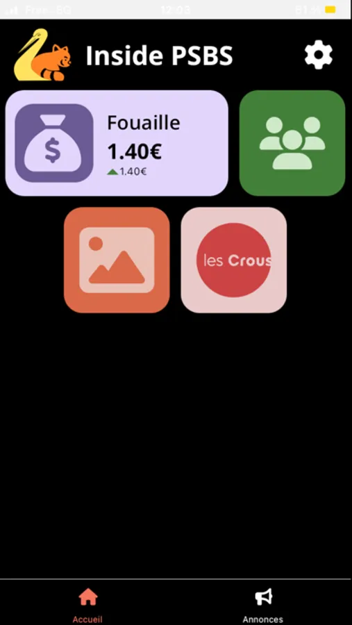 Tu pourras y retrouver la liste des Clubs et Assos et les annonces de la vie associative ainsi que ton solde Fouaille !! Le Crous Bot est également présent !!