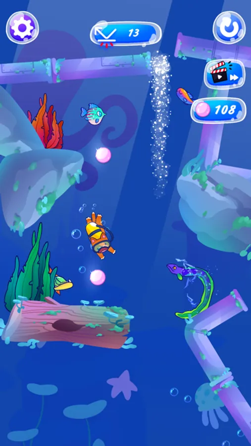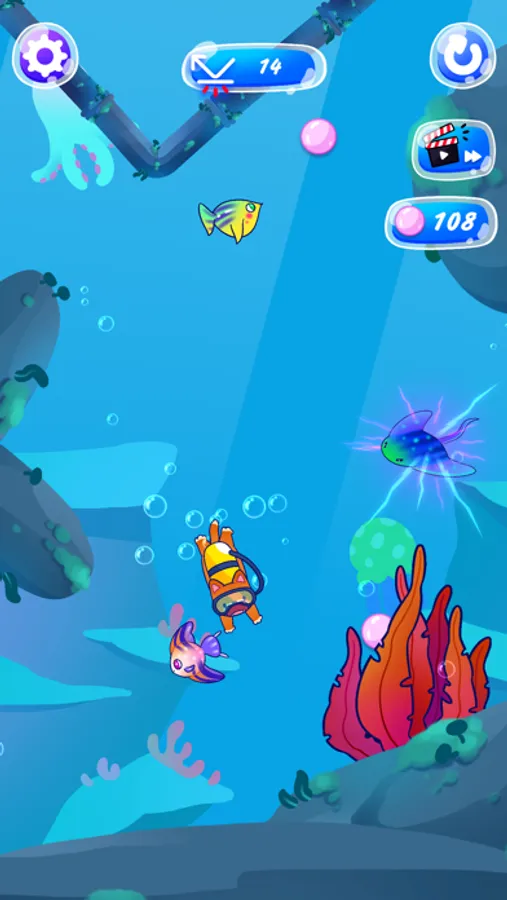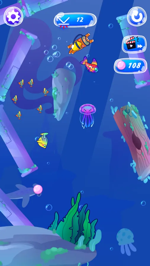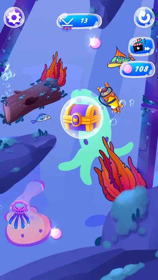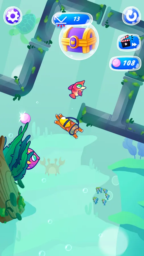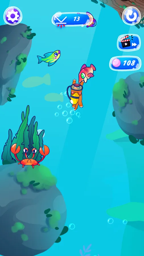 Simba Fishing - an exciting fishing game where you have to help the cat Simba catch all the fish with the least amount of bounces. Choose Simba's direction of movement to reach the goals faster, complete levels and earn stars for the best results. Don't forget to check the chests on the levels - they will help you unlock new outfits for Simba in the store. Enjoy the engaging gameplay and beautiful graphics in Simba Fishing!
