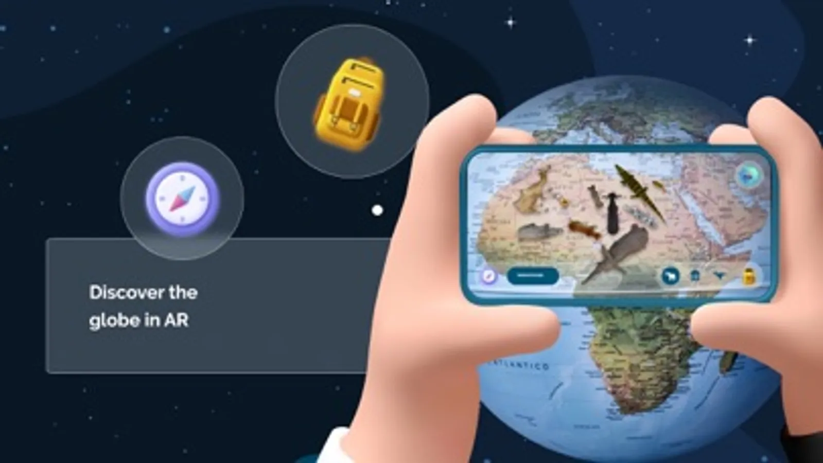 By focusing the camera of your device on the sphere of the globe, it’s possible to visualize, in overlay, animals, plants and important geographical sites in 3D.