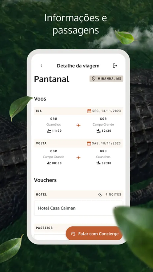 Nosso APP organiza todas as informações necessárias para que sua jornada seja memorável, como localizadores de voos, vouchers de hotéis e de passeios contratados.