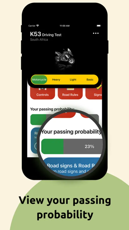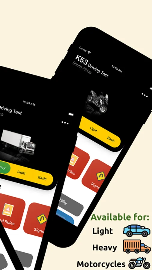 Master the K53 Driving Test in South Africa with the ultimate K53 Driving Test app! Learn road signs, road rules, and vehicle controls for light, heavy, and motorcycle vehicles with ease.