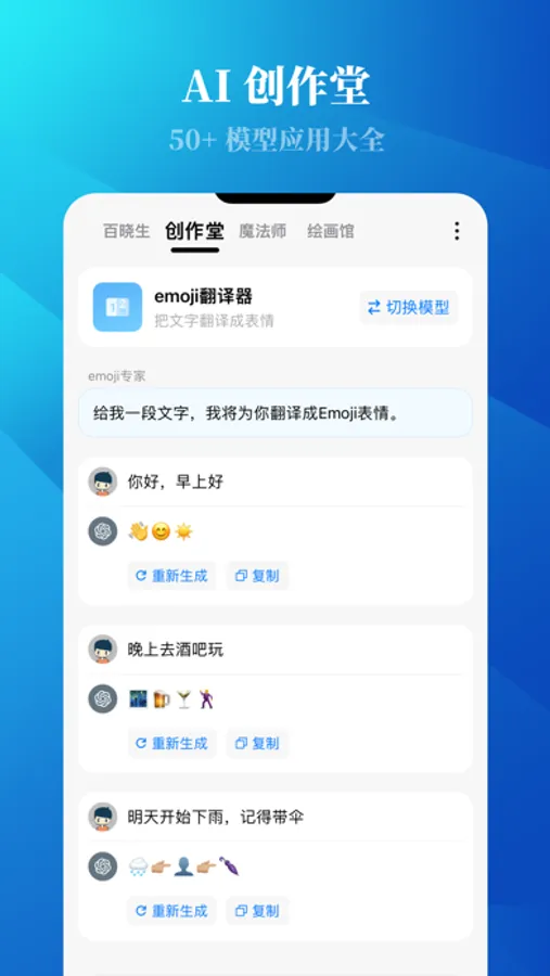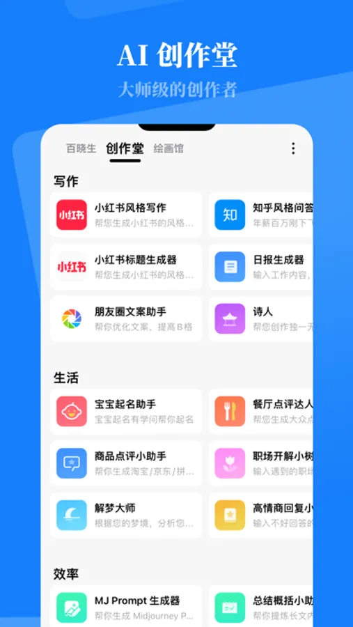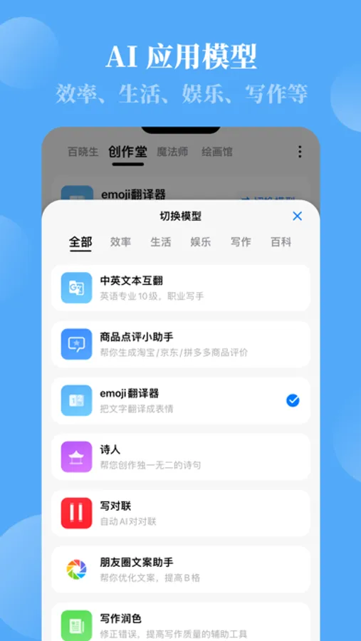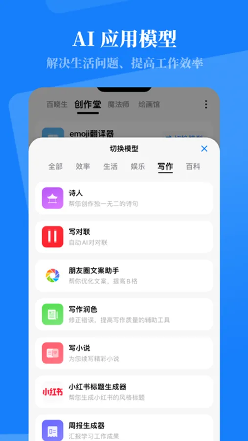 为了更好的帮你创作,我们内置了几十种模型,构建了一个个小应用,来帮你解决生活问题和提高工作效率。