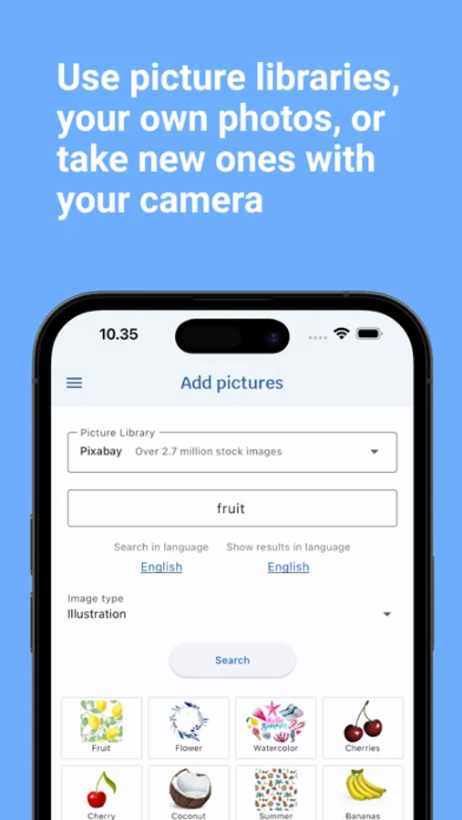 • Pictures From Different Sources: Access pictures from various libraries like Pixabay, PCS, Pictogram, Mulberry, or add from personal photos, downloads, or take photos with your camera.
