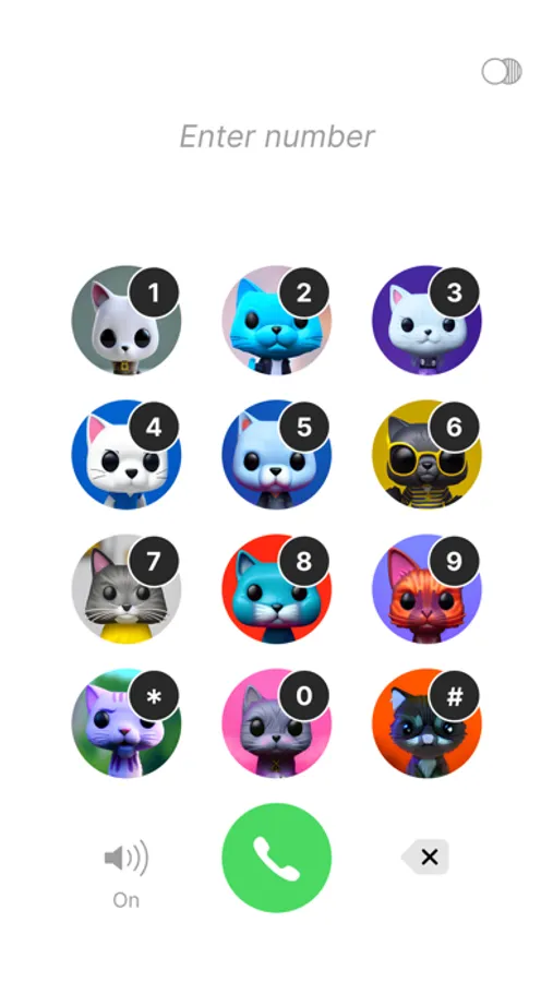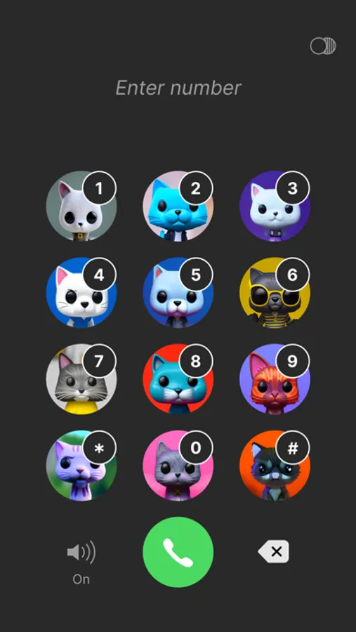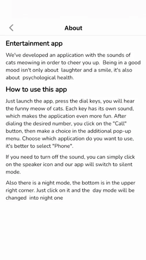 Just launch the app, press the dial keys, you will hear the funny meow of cats. Each key has its own sound, which makes the application even more fun. After dialing the desired number, you click on the "Call" button, then make a choice in the additional pop-up menu. Choose which application do you want to use, it's better to select "Phone".
