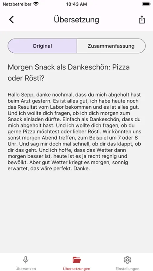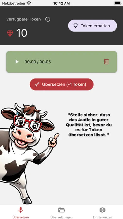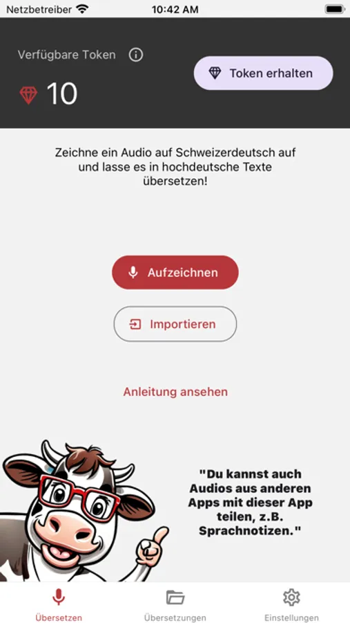 Erstelle ein Audio auf Schweizerdeutsch und lasse es in wenigen Sekunden in hochdeutsche Texte übersetzen! Danach kannst du die Texte auch in andere Apps laden und dort weiterverwenden. Du kannst auch Audios aus anderen Apps mit dieser App teilen und so übersetzen lassen.