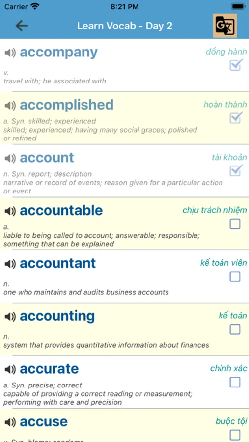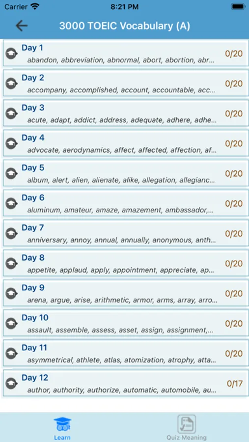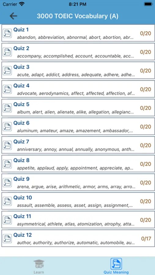 If you aim to enrich your TOEIC vocabulary, the first step is to have an appropriate word list. The 4000 TOEIC Vocabulary app provides you with over 4000 frequently used words in the TOEIC exams. It is certain to help you build the necessary vocabulary to achieve a high score in the TOEIC test.