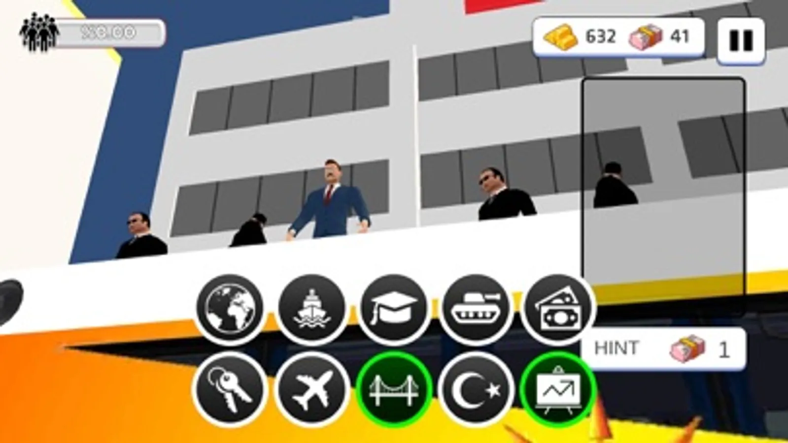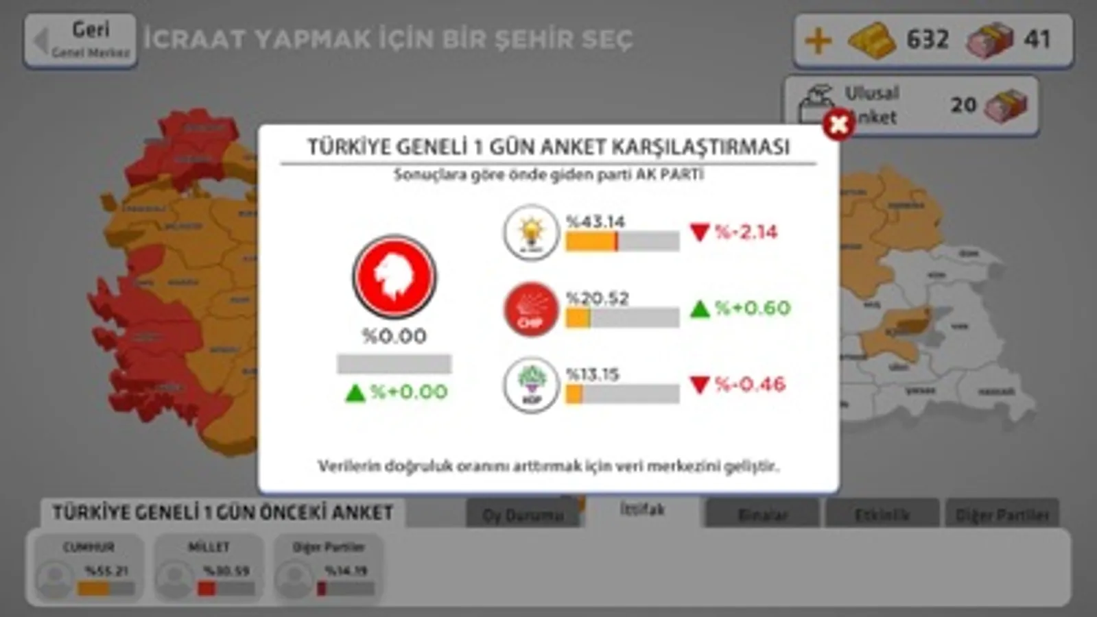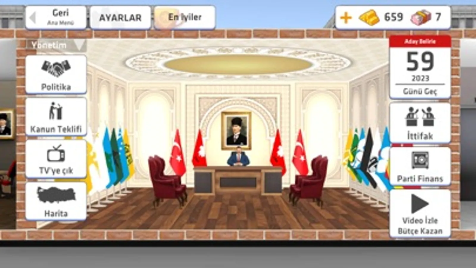 Get ready for the most exciting election game yet! Choose your favorite party or create your own custom party with your own character. Travel across Turkey to attend rallies and events, and make appearances on TV to attract voters and gain their support.