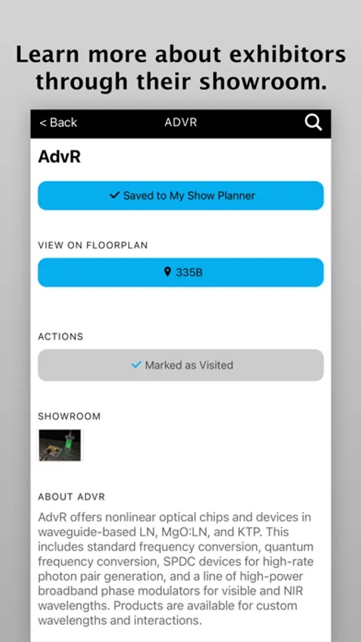 • Explore the Exhibition: Search for exhibitors in alphabetical order, and set a bookmark reminder to stop by their booth. (Tap on the map icon within a description, and you’ll find their location on an exhibit floor map.) View a daily schedule of all activities occurring on the show floor.