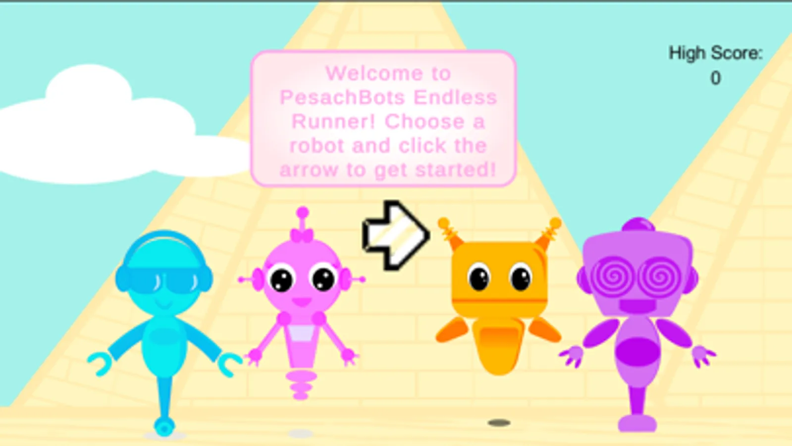 Avoid Egyptians and mummies, dodge lasers, and collect matzos! Choose from four robots and run through the pyramids, or escape through the sea.