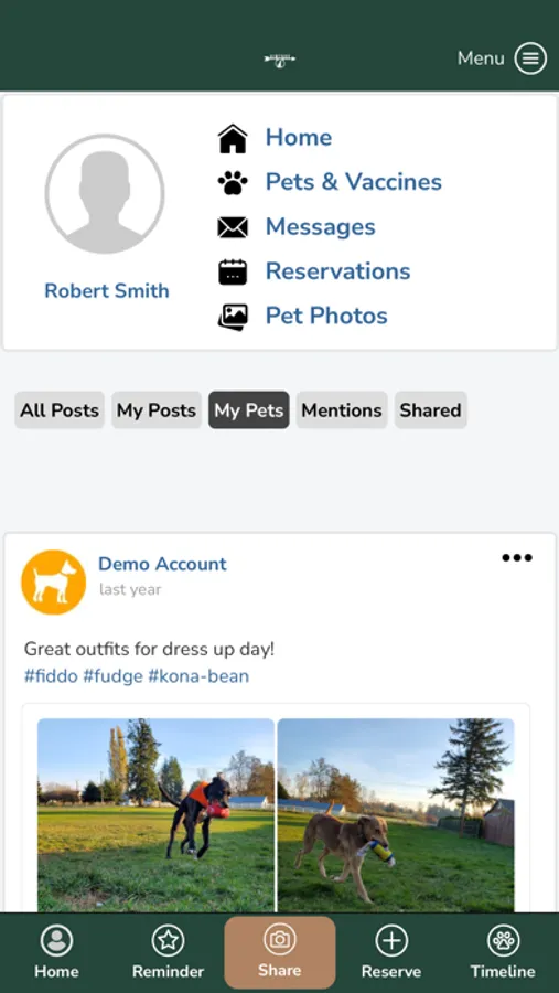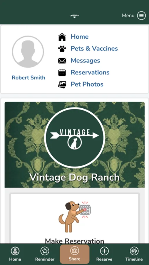 The Vintage Dog Ranch App enables users to make reservations, purchase package credits, see and pay invoices, message with Vintage Dog Ranch, see photos of their pets, and more. Employees of Vintage Dog Ranch are able to manage the business and connect with customers. This app is made specifically for the customers and employees of Vintage Dog Ranch.