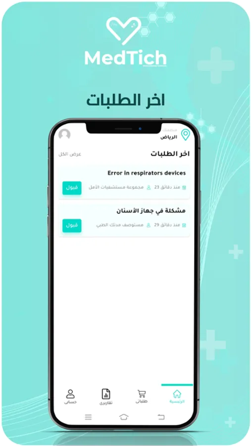 إذا كنت مهندس صيانة أو فني صيانة ولديك خبرة عالية في صيانة الأجهزة والمعدات الطبية قم بالتسجيل علي التطبيق واختار المدينة المتواجد فيها لاستقبال طلبات الصيانة علي الفور والتي ستظهر حسب موقعك