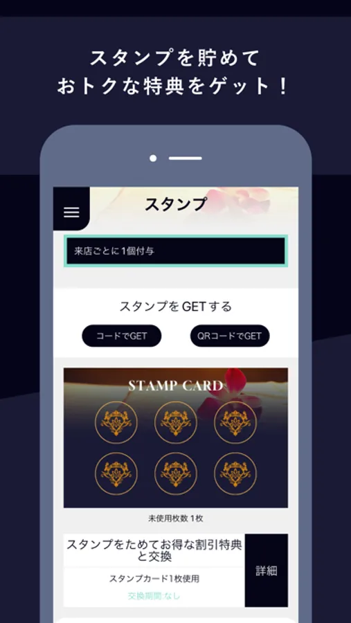 スタンプ:ご来店ごとにたまるスタンプカードです。ためるとお得な特典もご用意しています!