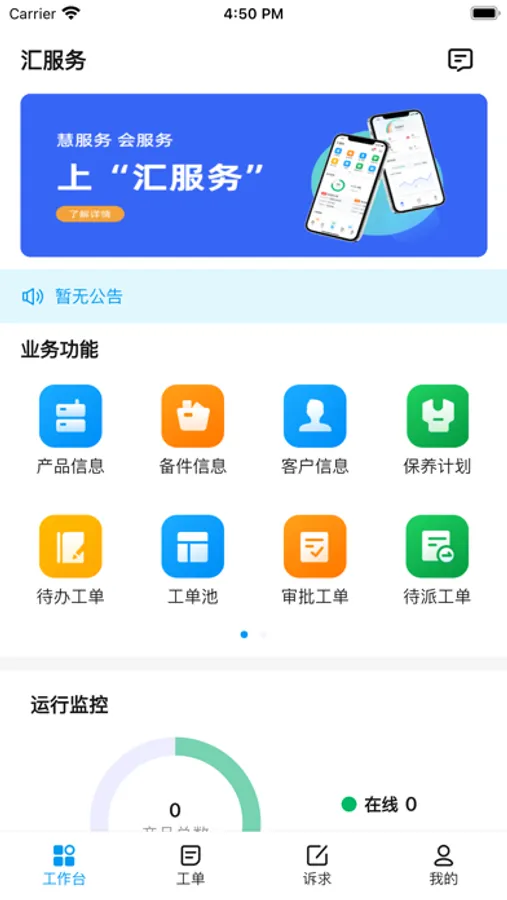 汇服务是一款面向设备厂商售后服务部门的简单实用的“物联+”数字化售后服务软件平台, 集成客户诉求反馈、工单流程闭环、产品二维码、物联远程调试、事件告警提醒等功能,实现7*24小时物联智慧服务,汇聚产品服务、客户服务等运维数据,沉淀服务数据资产,实现售后服务管理,让客户更满意,让运营更高效。
