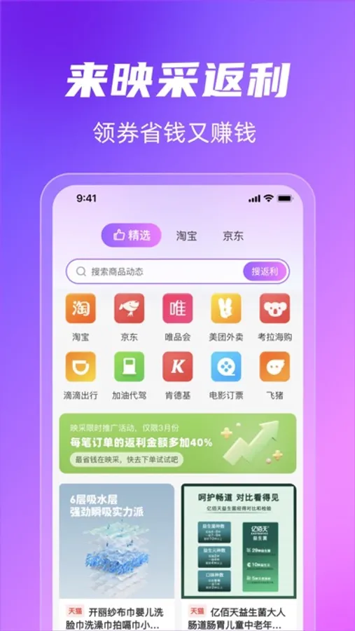 映采返利是一款电商平台优惠券购物返利软件,吃、喝、玩、乐、购一站式,便利、返利全享受,“少花钱,多省钱,多生钱”,带给大家不一样的购物体验~