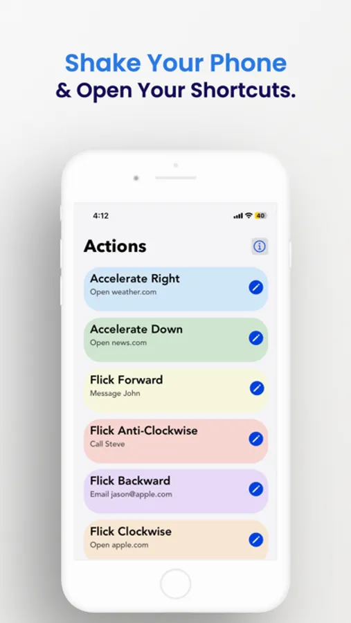 Set up shortcuts in a snap by tapping the edit button and selecting your preferred options. Once configured, just shake your phone in the specified direction for quick and easy access to your shortcuts!