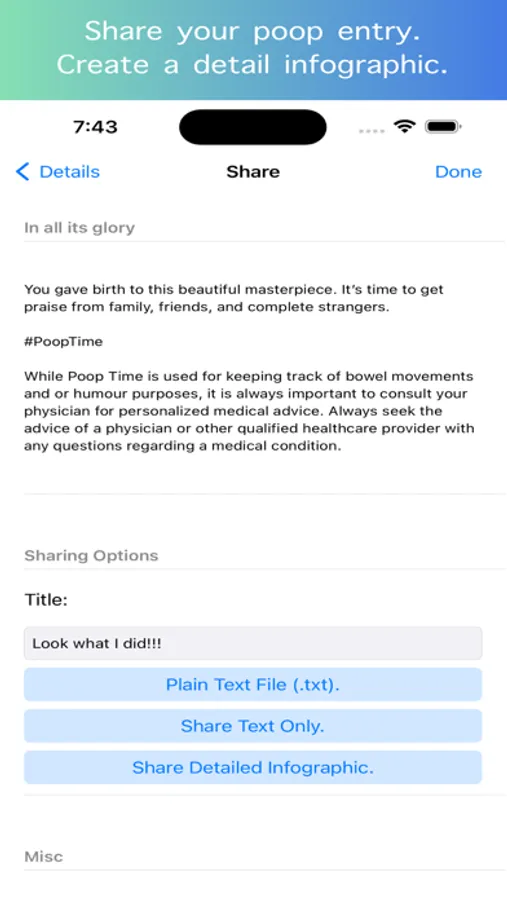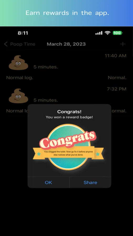 - Get rewarded inside the app for your poop activity. Share your new rewards among friends, on social media, or keep them to yourself.