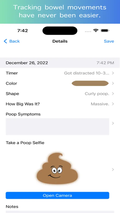 - Create a detailed history of your poop activity such as how long it takes, color, shape, size, a list of poop symptoms, take poop selfies, and notes.