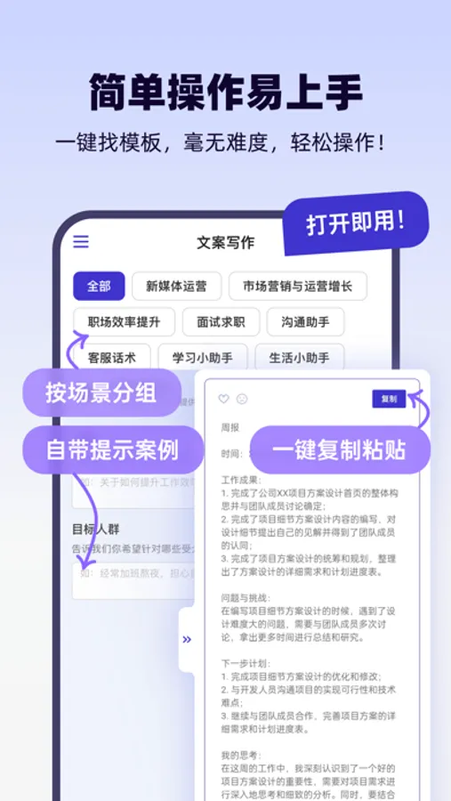 “轻松鲨”是一款基于AI技术的智能工具,旨在为用户提供高效、专业的文字生成服务。目前,轻松鲨提供了丰富的文字模板,用户只需输入部分信息,即可轻松生成高质量的文稿,大大节省了用户的时间和精力。