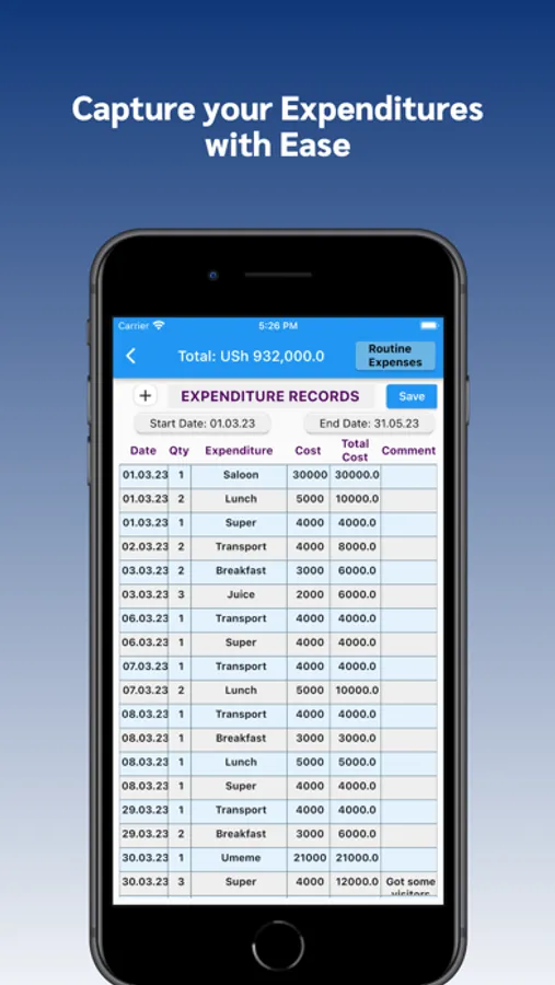Record your expenditures here. If you have routine expenditures you can add them in Routine Expenditures to use as auto suggestions.