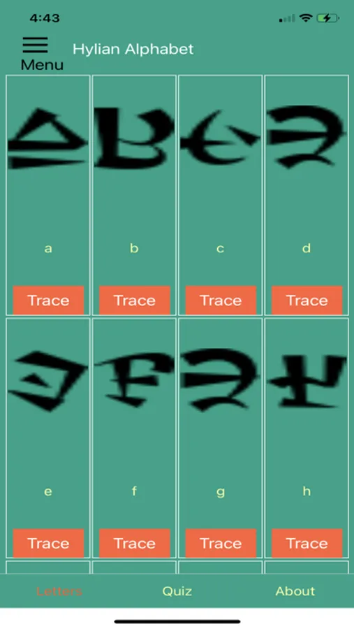 This app can help you learn the writing systems of Hyrule! Practice tracing each one until you're familiar-- then quiz yourself on the letters!