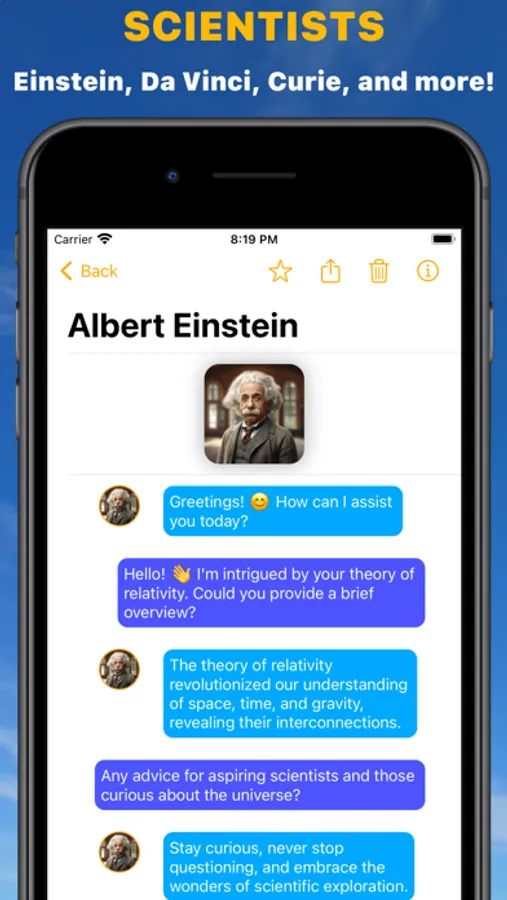 - Global Icons: Chat with renowned scientists like Albert Einstein, Isaac Newton, Marie Curie, and Nikola Tesla. Experience conversations with world leaders such as Winston Churchill, Napoleon Bonaparte, Julius Caesar, and Cleopatra.
