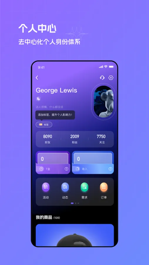 下方是个人中心页面,首页会展示个人信息的摘要,通过上划可以打开个人中心,里面包含个人信息, 个人商品和订单,设置等功能页面。