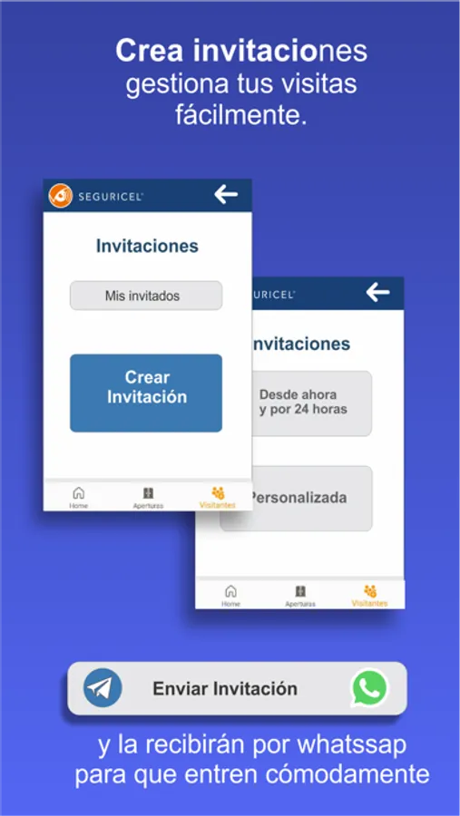 • Podrá crear invitaciones para sus visitantes, quienes recibirán en su WhatsApp el código QR de invitación. Una vez que su invitado llegue a la residencia podrá mostrarle al vigilante el código QR de la invitación o bien entrar por proximidad igual que usted, descargando la App para visitantes. Una vez abierta la puerta usted recibirá un mensaje con la notificación que su invitado ha llegado.