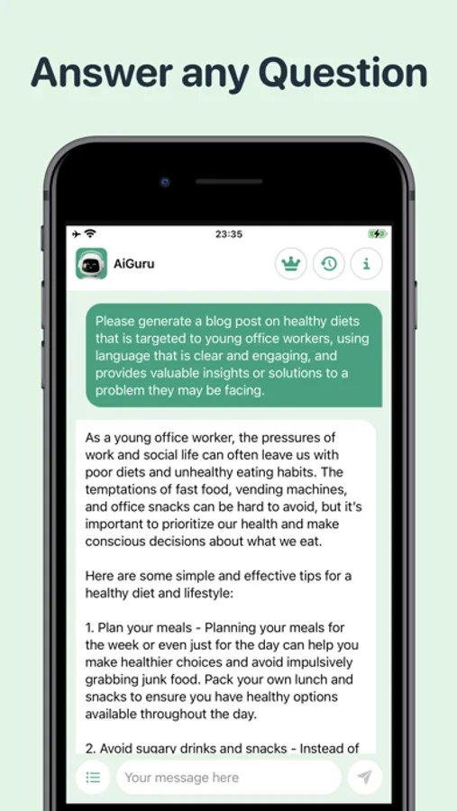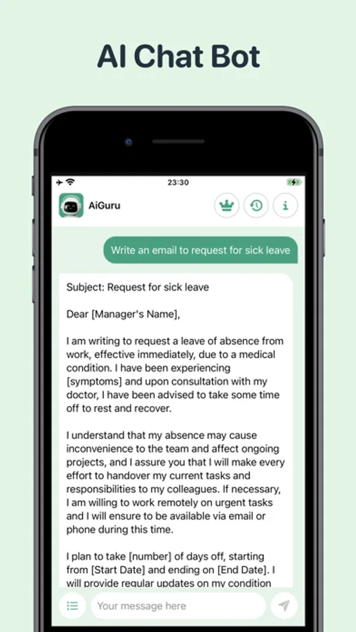 With our app, you can easily and quickly generate accurate and relevant responses to any questions that come your way. Our AI-powered technology uses the latest natural language processing algorithms to understand and analyze complex queries, ensuring that you always receive the most comprehensive and accurate responses possible. What you need to do is to simply type your questions or requests, AiGuru will then be at your service. Even if making chat prompts is a hard nut to crack for you, you can totally choose from suggested templates to start the conversations with AiGuru.