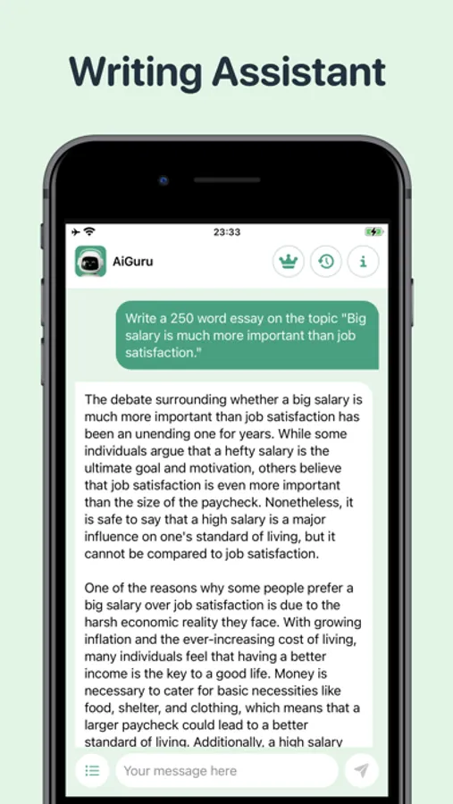 Our advanced AI Chat Bot Assistant is designed to help you with all your writing needs. Whether you need to write emails, papers, essays, or simply answer any question, our app is a perfect solution as well as an excellent assistant for you. Moreover, our app also features a range of writing tools that make it easy to create and edit emails, papers, and essays. From auto-suggestions to grammar checks, our app ensures that your writing is always clear, concise, and error-free.
