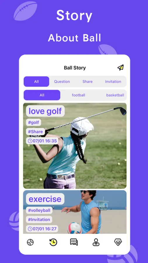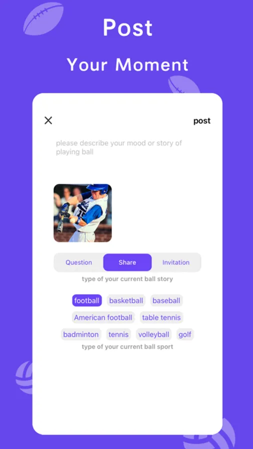 - Post your story about sport of ball, at the same time, you can choose whether your story is to be Shared, Questions, or Invited. You can share your current mood, raise some questions about the ball game, or invite others to participate in a ball game.