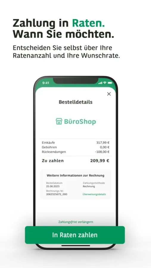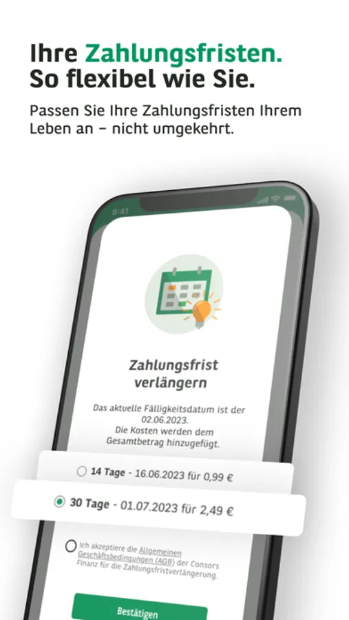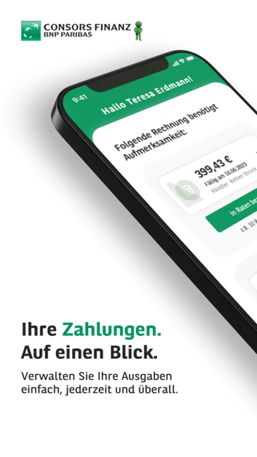 Mit CONSORS FINANZ PAY haben Sie Ihre Einkäufe rund um die Uhr im Griff. Verwalten Sie Ihre Bestell- und Rechnungsdetails aufgeräumt in einer App und erhalten Sie finanzielle Freiheit durch flexible Rückzahlungsoptionen.