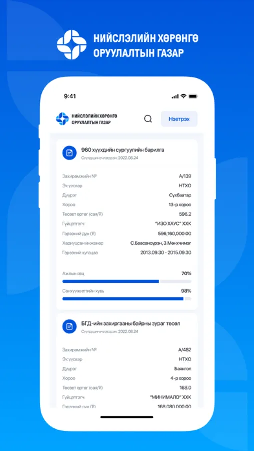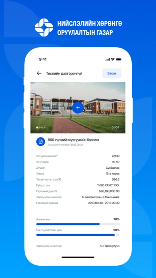 Нийслэлийн Хөрөнгө оруулалтын газраар Улс, Нийслэл, Орон нутгийн хөгжлийн сангийн хөрөнгө оруулалт, гадаадын зээл, тусламж болон бусад хөрөнгийн эх үүсвэрээр Нийслэл хотод хэрэгжүүлж буй төсөл арга хэмжээ, барилга байгууламж, их засвар тохижилт, бүтээн байгуулалтын ажилд захиалагчийн техникийн хяналтыг хэрэгжүүлэн ажилладаг бөгөөд та бүтээн байгуулалтын ажлын явцын мэдээлэлтэй танилцаж, хяналт тавих боломжтой.
