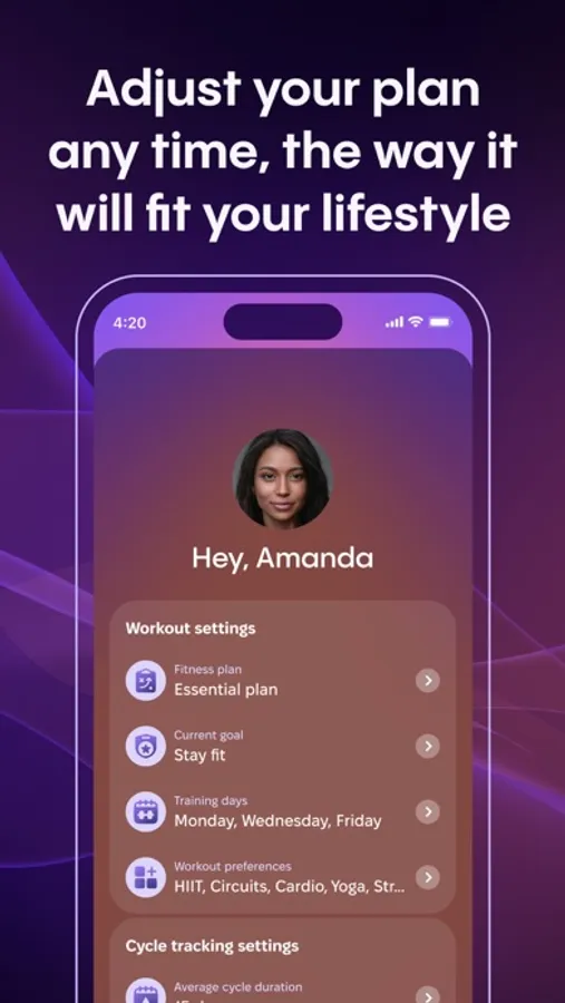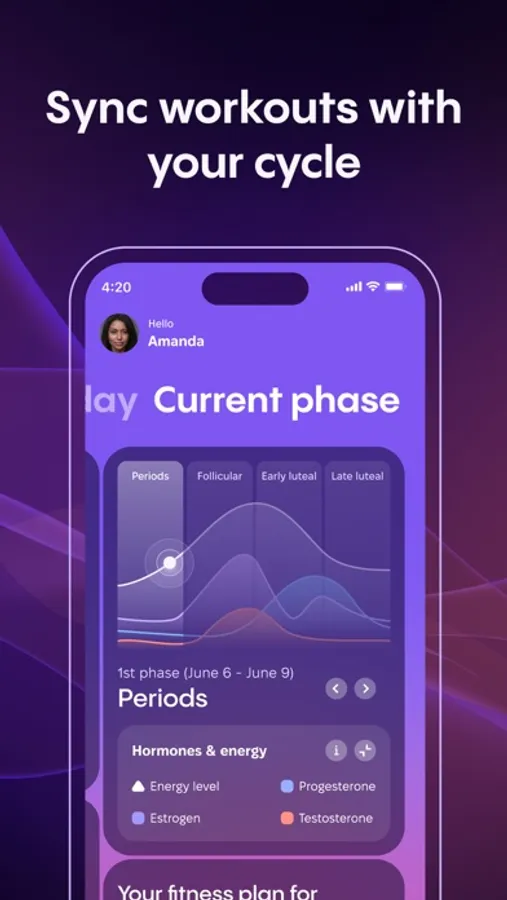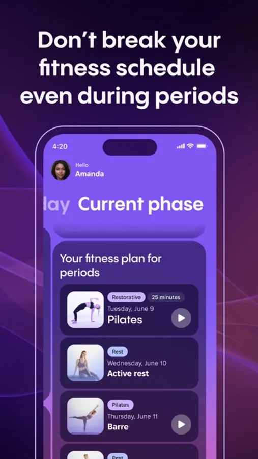 - Individual workout plan based on your menstrual cycle, level of daily physical activity, preferred workout days, and desired types of main and restorative workouts.