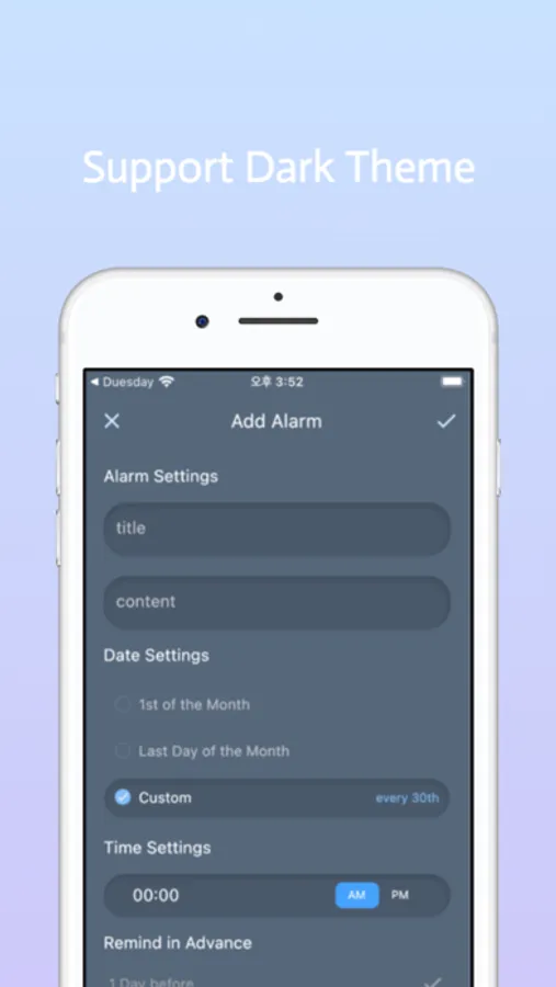 DuesDay is a monthly reminder alarm app that helps you manage recurring payments such as rent, utilities, and subscriptions. Keep track of important dates and manage your daily life more efficiently!
