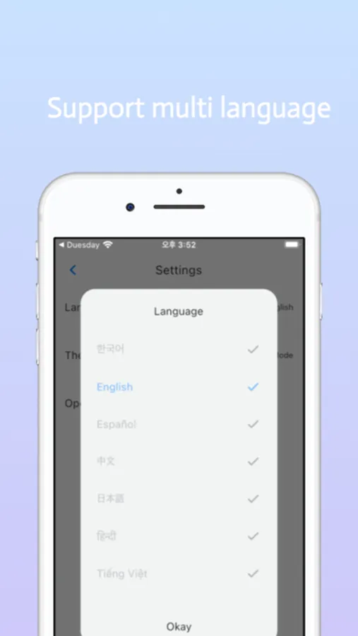 English, Korean, Chinese, Japanese, Spanish, Hindi, and Vietnamese.