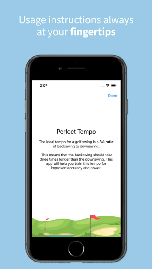 The Audio Training feature produces three tones on a loop at you desired swing speed. Pop in some ear buds and take it out to the range to perfect your tempo. Or listen to it between shots on the course to remember the correct tempo.