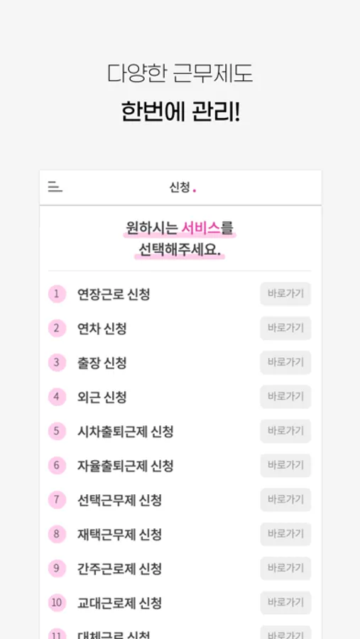언제 어디서나 모바일로 간편하게 근무관련 사항(연장근로, 휴가, 출장, 외근)을 신청하고 근로 내역을 조회할수 있습니다.