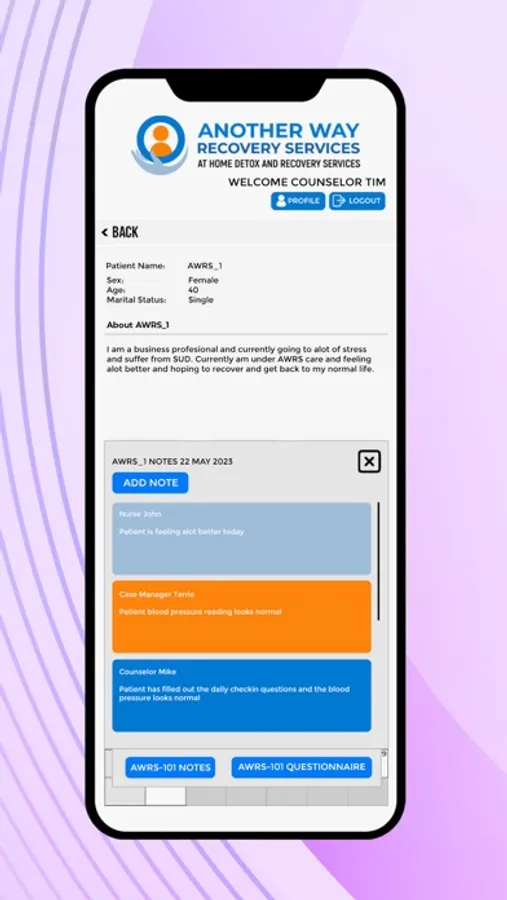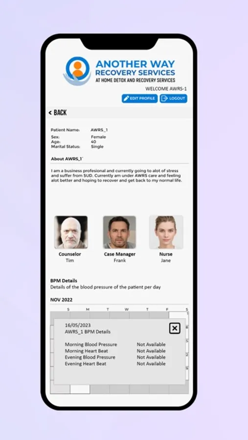 AWRS qualified team accounts (Counselor – Case Manager - Nurse) will be created by the admin only and they are assigned to each patient for the ultimate care.