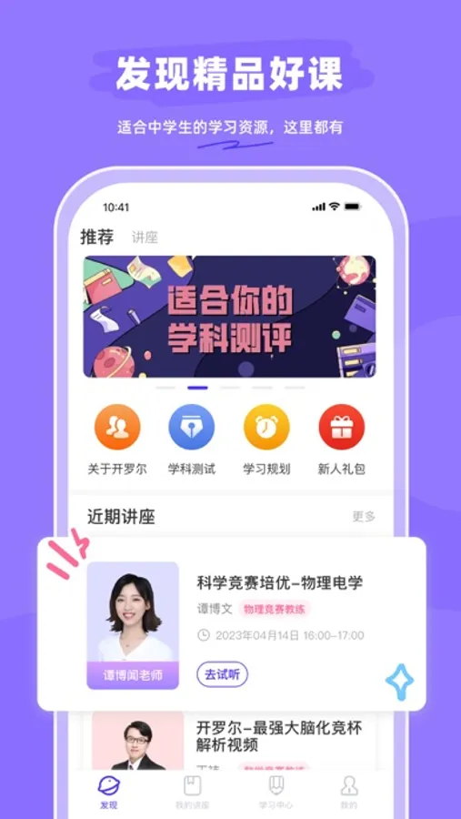 已上线物理、生物、化学和数学四个学科,不同学科间自由切换。每周均有直播竞赛讲座,帮助学员更轻松的衔接物理竞赛,生物竞赛,化学竞赛,数学竞赛。