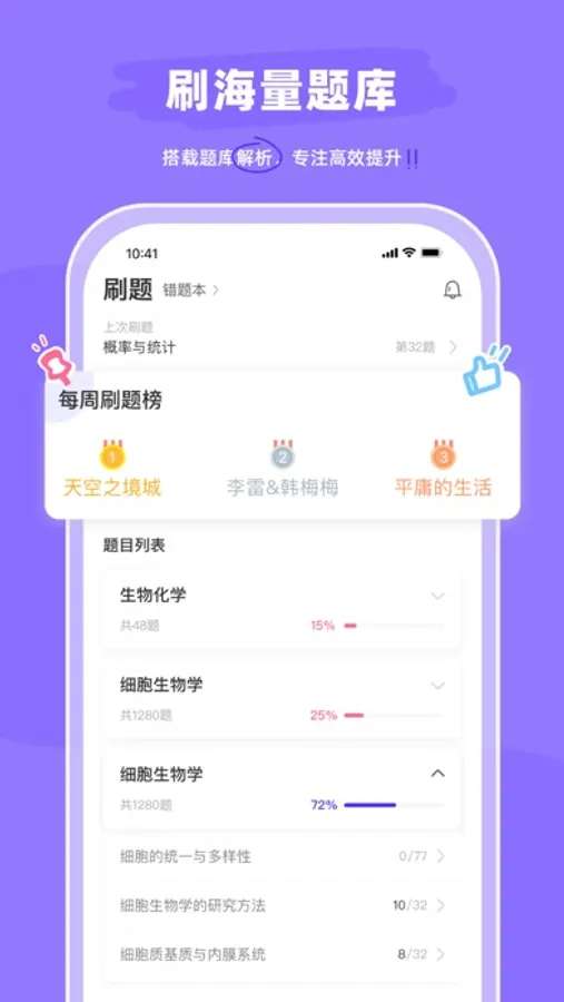 仍然在不断扩充的题库,不收取任何费用,海量经典题目无限刷。题目提供完善的题目解析,提升刷题效率。另有刷题排行榜,可查看自己每周的刷题量和正确率,看到自己和Dalao的差距,冲击全国奥林匹克竞赛,助力你的学习