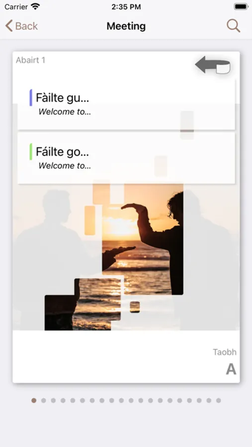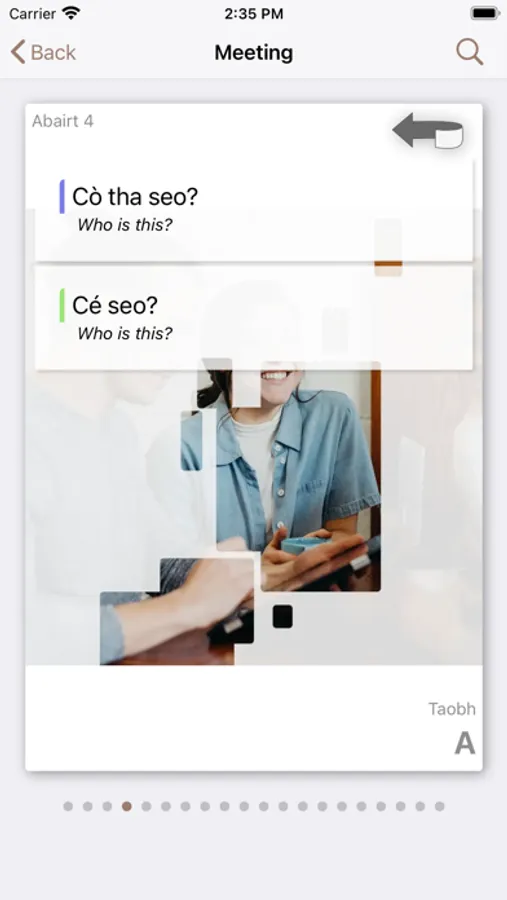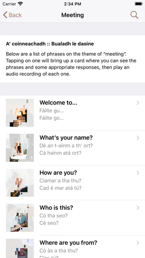 This app consists of common phrases in Scottish Gaelic and Irish, with audio by native speakers. Each phrase appears on a "card" within the app and suggested responses can be seen by turning the card over.